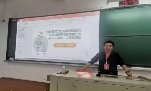 在“美国政治制度与政治生态研究”分论坛,艾喜荣教授任主持人并宣读了论文“特朗普第二任期美国政府对边境与移民问题的再安全化——动因、过程及影响”。论文以哥本哈根学派安全化理论为核心分析框架,系统分析了特朗普政府推动边境与移民问题再安全化的逻辑进路,旨在厘清这一政策转向的运作机制与深层逻辑,为理解美国移民政策的阶段性特征及后续效应提供学理支撑。论文的研究视角、学术观点和论证过程得到同行学者的肯定。