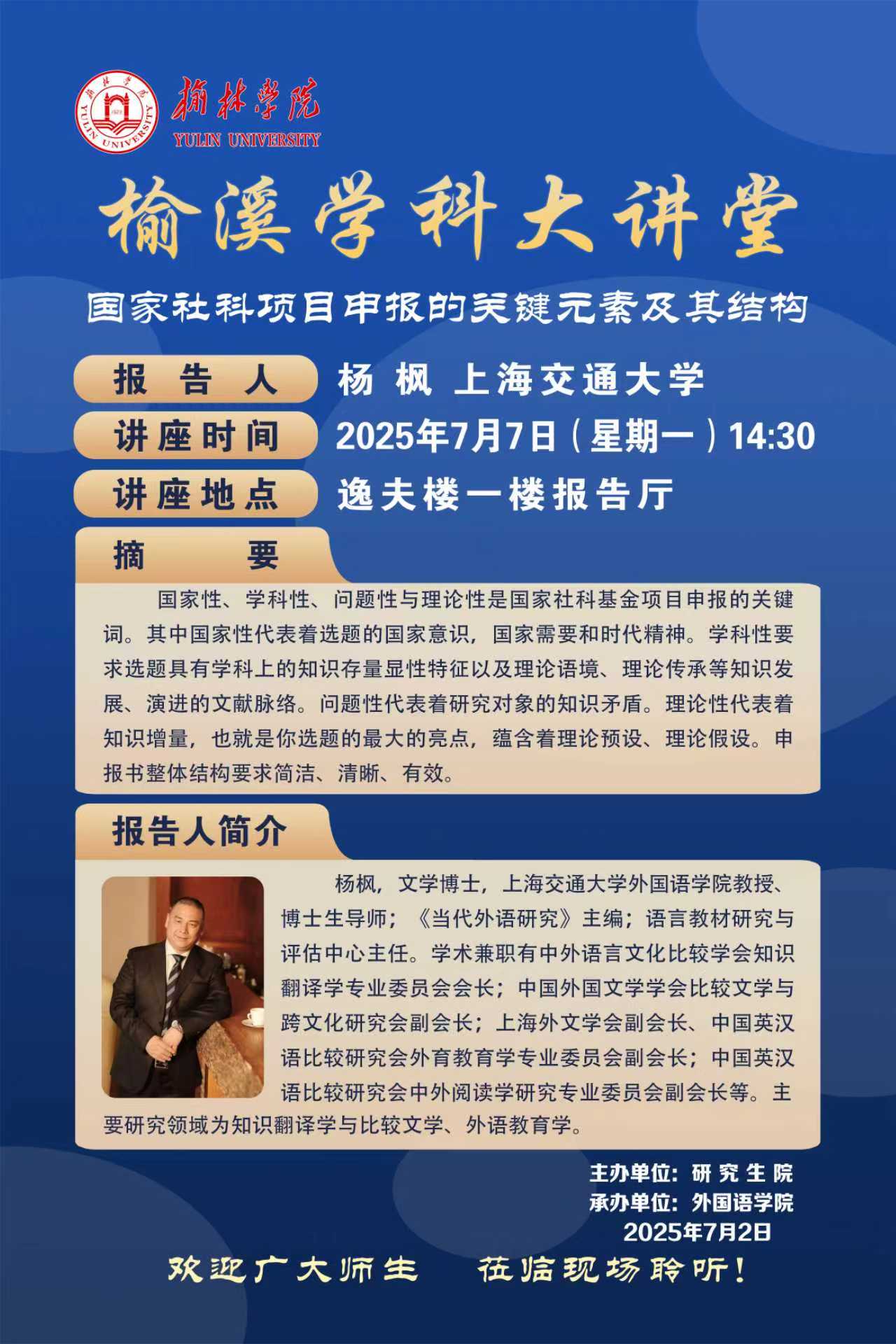 2025年7月7日下午,由研究生院主办、威廉希尔williamhill承办的“榆溪学科大讲堂”在逸夫楼一楼报告厅成功举行。上海交通大学威廉希尔williamhill教授、博士生导师杨枫应邀担任主讲,作了题为《国家社科项目申报的关键元素及其结构》的学术报告。本次讲座由威廉希尔williamhill副院长徐庆宏教授主持,威廉希尔williamhill师生代表及各学院对国家社科项目申报感兴趣的教师积极参与本次专题讲座。